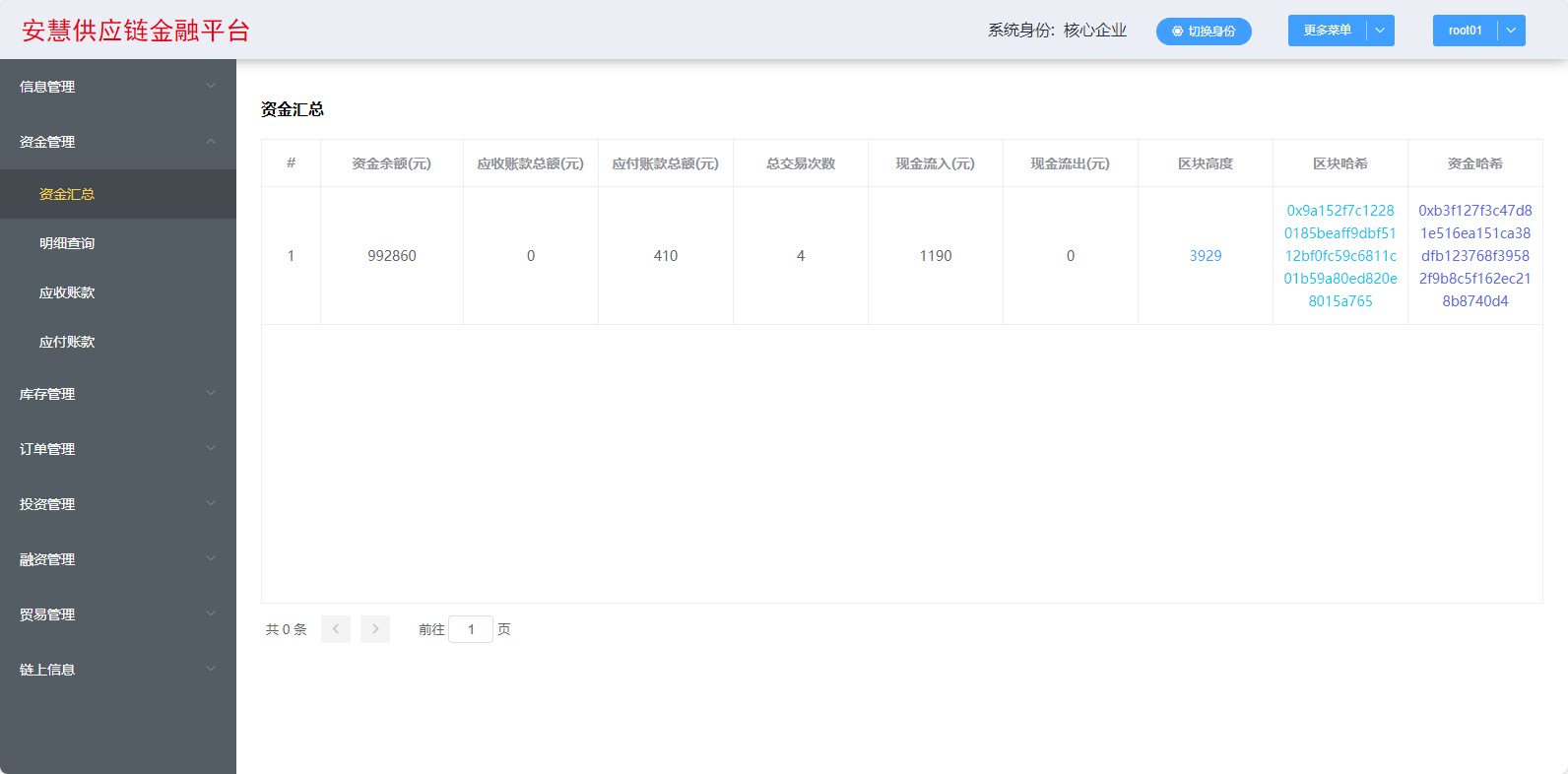本系统以区块链、加密共识、智能合约等技术为支撑,以核心企业为链的主导,包含供应链金融中的各个角色和功能,加入了人工智能和风险评估模型,提供供应链金融的投融资风险预测、风险评估、风险预警等核心问题,成功预测传统供应链融资难度和成本测算,全面提升供应链金融运行环境安全可靠性。为传统供应链金融体系内的各个参与方提供一种可以通过去中心化、去信任的架构实现快速的登记、交易和流转信息认证,简化企业或个人的征信流程,提高供应链金融管理的效率和可信度,通过公开信息的彼此共识进行可靠性的保证。用区块链技术来解决和改良传统供应链金融中存在的融资难、融资贵、信息不透明、风险难把控等公认痛点,通过平台的集约效力实现整个行业中小企业“物流”、“商流”、“资金流”、“信息流”的四流合一。